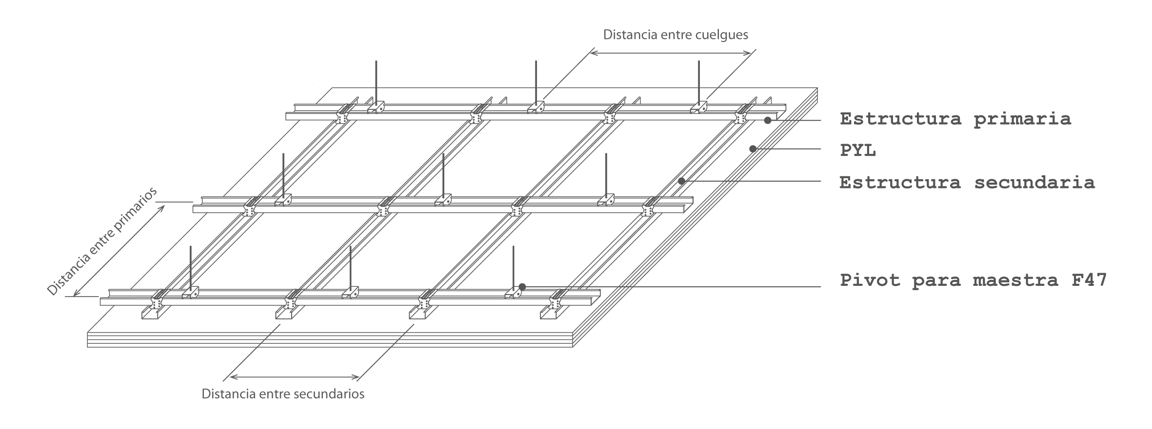 Techo continuo formado por cuatro placas de yeso laminado del tipo F Cortafuegos de la marca ISOPLAC de 12,5 mm de espesor; atornilladas a una estructura de perfiles F-47 (primarios y secundarios), y suspendido bajo varilla roscada M-6 y pivot F-47. Incluye tornillería, pastas, cinta para juntas...etc. Tanto la perfilería como los accesorios son de la marca ISOPRACTIC. Totalmente terminado y listo para pintar.