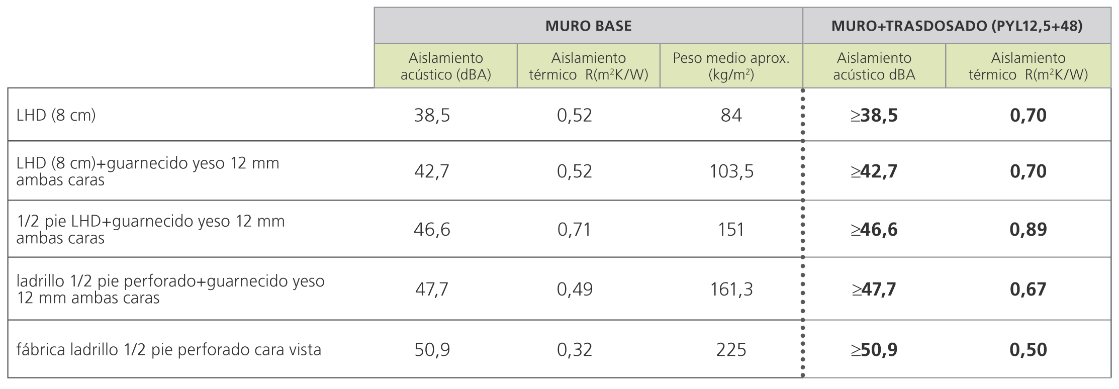 **NOTA: Según UNE 102041 IN un trasdosado con una sola PYL a cada lado debe ser como mínimo de 15 mm de espesor cada PYL. El trasdosado 60,5/400 sólo es válido en obras de reforma, trabajos de decoración, compartimentación eventual, etc. |