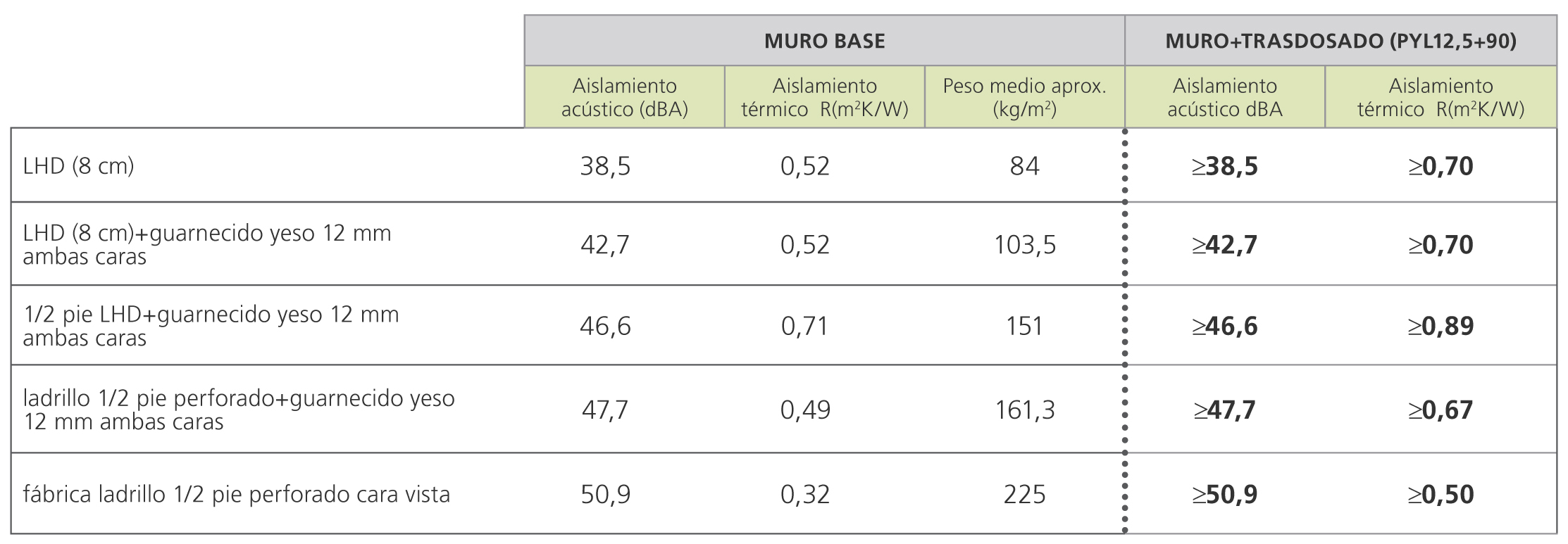 **NOTA: Según UNE 102041 IN un trasdosado con una sola PYL a cada lado debe ser como mínimo de 15 mm de espesor cada PYL. El trasdosado 60,5/400 sólo es válido en obras de reforma, trabajos de decoración, compartimentación eventual, etc. |