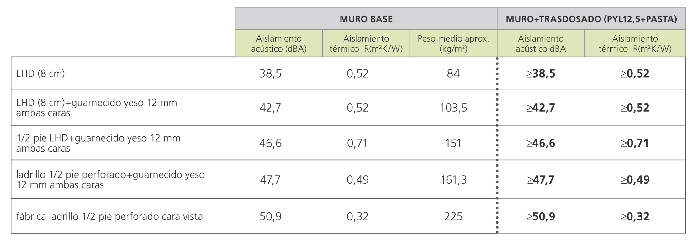 **NOTA: Según UNE 102043 un trasdosado directo con una sola PYL debe ser como mínimo de 15 mm de espesor. El trasdosado 25/PASTA sólo es válido en obras de reforma, trabajos de decoración, compartimentación eventual, etc. en donde no sean aplicables exigencias normativas relativas a edificios de nueva planta. |