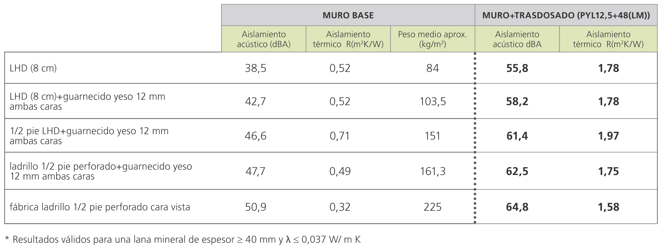**NOTA: Según UNE 102041 IN un trasdosado con una sola PYL a cada lado debe ser como mínimo de 15 mm de espesor cada PYL. El trasdosado 60,5/400 sólo es válido en obras de reforma, trabajos de decoración, compartimentación eventual, etc. |